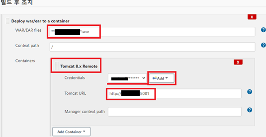 - Credentail 에 Add 클릭 하여 Tomcat 에서 users.xml에 설정한 사용자(매니저) 정보 입력 추가
