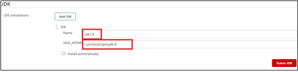 JDK 탭에서 ADD > Name 입력 > JAVA_HOME 란에 경로입력 ( /usr/local/openjdk-8 )