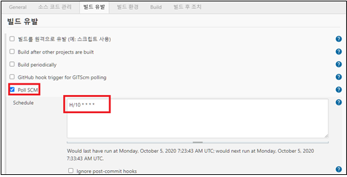Poll SCM 체크 > Schedule 란에 “ H/10 * * * * ” 추가 (매 10분마다 푸시된 내역 있으면 자동 빌드 진행)